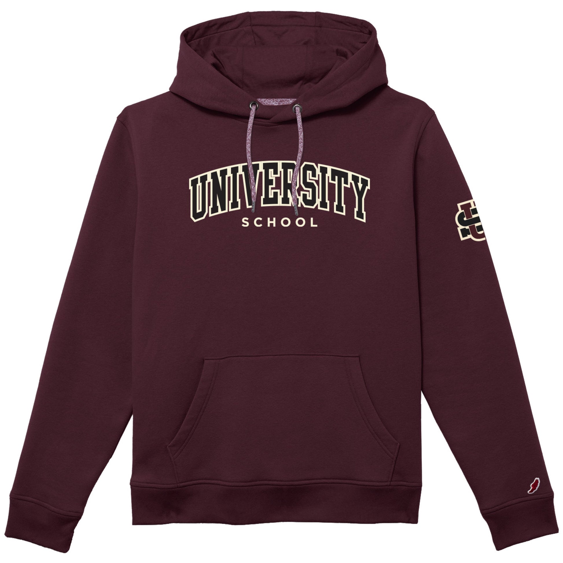 League PFM110 1991 Hoodie with "University School" embroidered in an arch on the center chest, and the US Interlocking logo embroidered on the left sleeve.