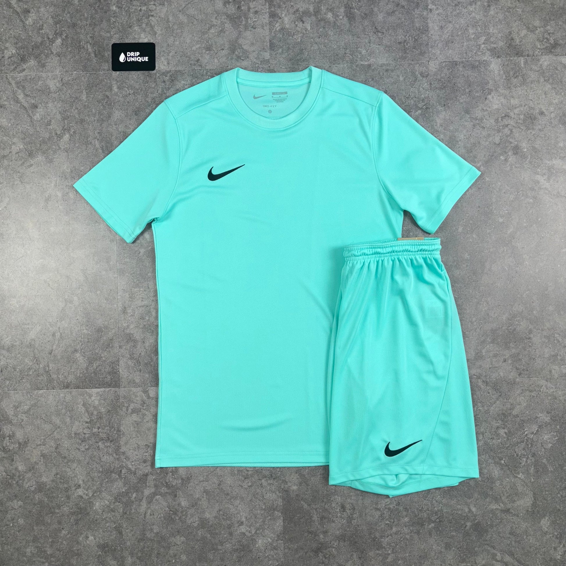 Introducing the popular Nike Dri-Fit Set in a Turquoise Blue Colourway. This Nike Dri Fit Set features a breathable, lightweight and slim fit design and uses Dri Fit tech to help wick away sweat, keeping your dry for longer! This Nike Set is paired with the bestselling Nike Dri Fit Shorts in a Turquoise Blue colourway which feature a relaxed and comfortable fit, and an elasticated waistband making this set perfect for any task!