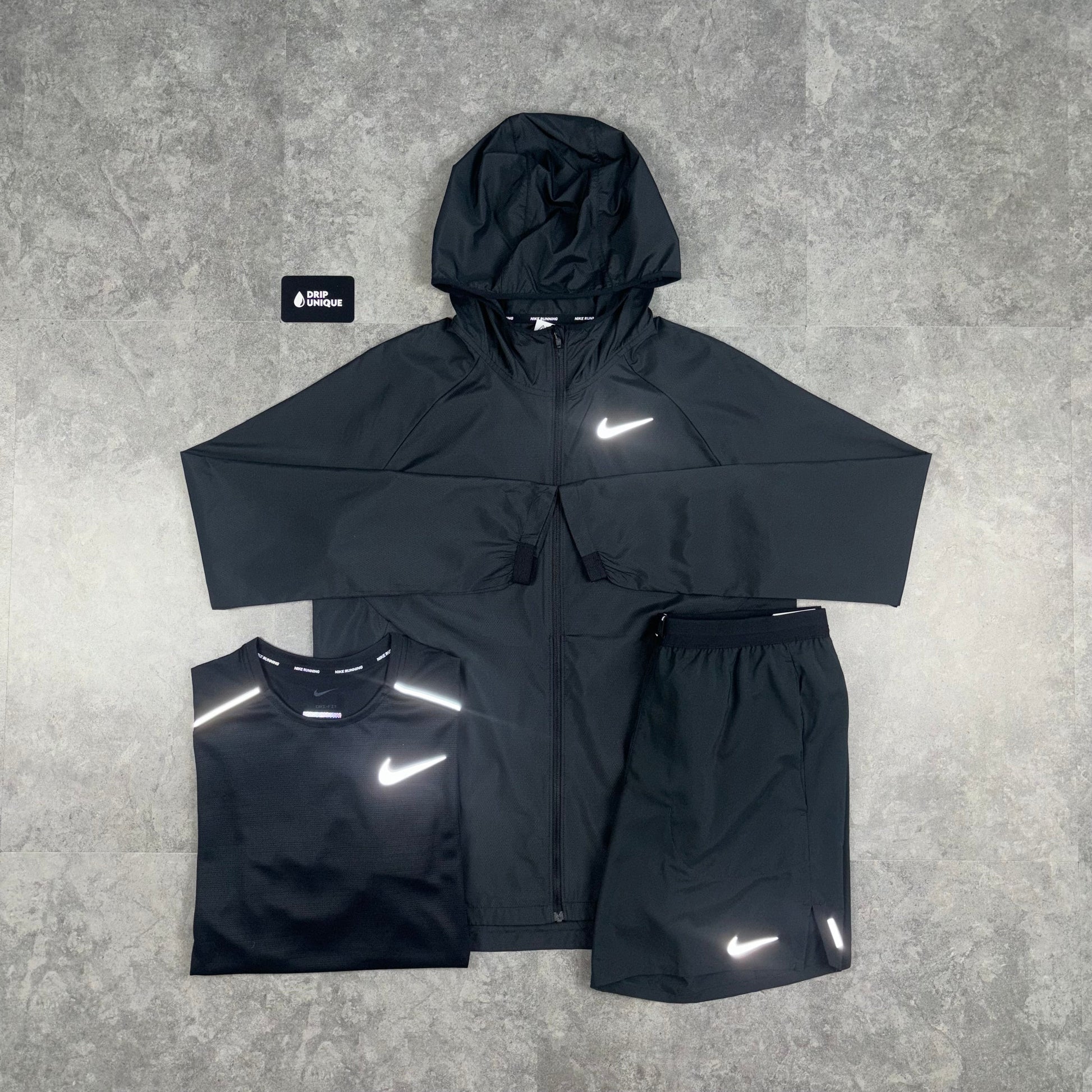 Stay ahead of the game with the popular Nike Essential Windrunner Black Bundle in a Black colourway. A must have addition to any wardrobe, this Nike Windrunner Bundle features a windproof, lightweight and water-resistant design, making it the ideal choice for any occasion. Combined with Zip-Up pockets, an adjustable hood and paired with the popular Nike Flex Stride Shorts, as well as the bestselling Nike Miler T Shirts in a matching Black colourway, one of our bestsellers!
